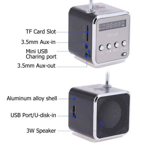 TD-V26 — це компактне маленьке радіо, портативна колонка, міні аудіосистема, FM-радіоприймач та музичний плеєр в одному пристрої. Ідеальний варіант для дому, подорожей або відпочинку на природі.