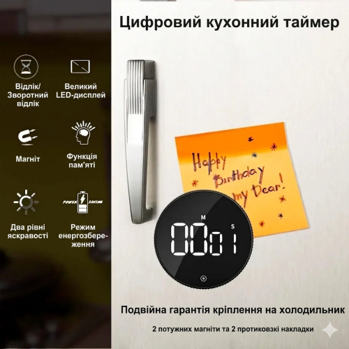Кухонний таймер на магніті — це зручний цифровий пристрій, який допоможе точно контролювати час приготування страв, тренувань або повсякденних справ. Його легко закріпити магнітом на холодильнику, і він завжди буде під рукою.