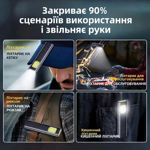Ліхтарик оснащений магнітом та кліпсою — його можна прикріпити до металевої поверхні або до капелюха, кишені чи рюкзака. Це звільняє руки та робить його максимально зручним у використанні під час ремонту, кемпінгу або роботи.